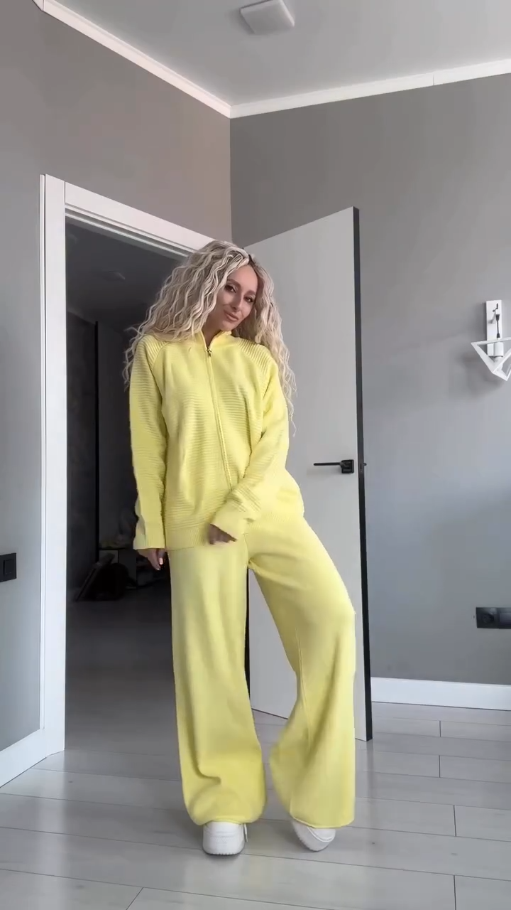 La chaqueta con cremallera frontal y cuello alto añade funcionalidad y modernidad, mientras que el pantalón de pierna ancha aporta fluidez y libertad de movimiento. Su tejido de punto acanalado ofrece elasticidad y estructura, logrando un equilibrio perfecto entre confort y diseño.