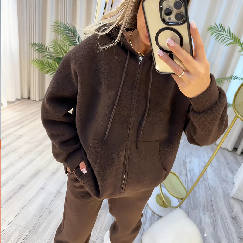 El acabado pulido del tejido y la confección detallada aportan un aire de distinción. La sudadera con capucha y cremallera frontal ofrece practicidad y abrigo, mientras que el pantalón de corte recto se adapta al cuerpo con un calce perfecto.
