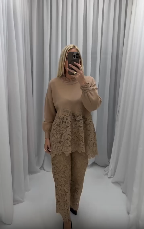 El suéter presenta un corte relajado con puños ajustados y caída amplia, mientras que el pantalón fluido aporta ligereza y elegancia en cada paso.