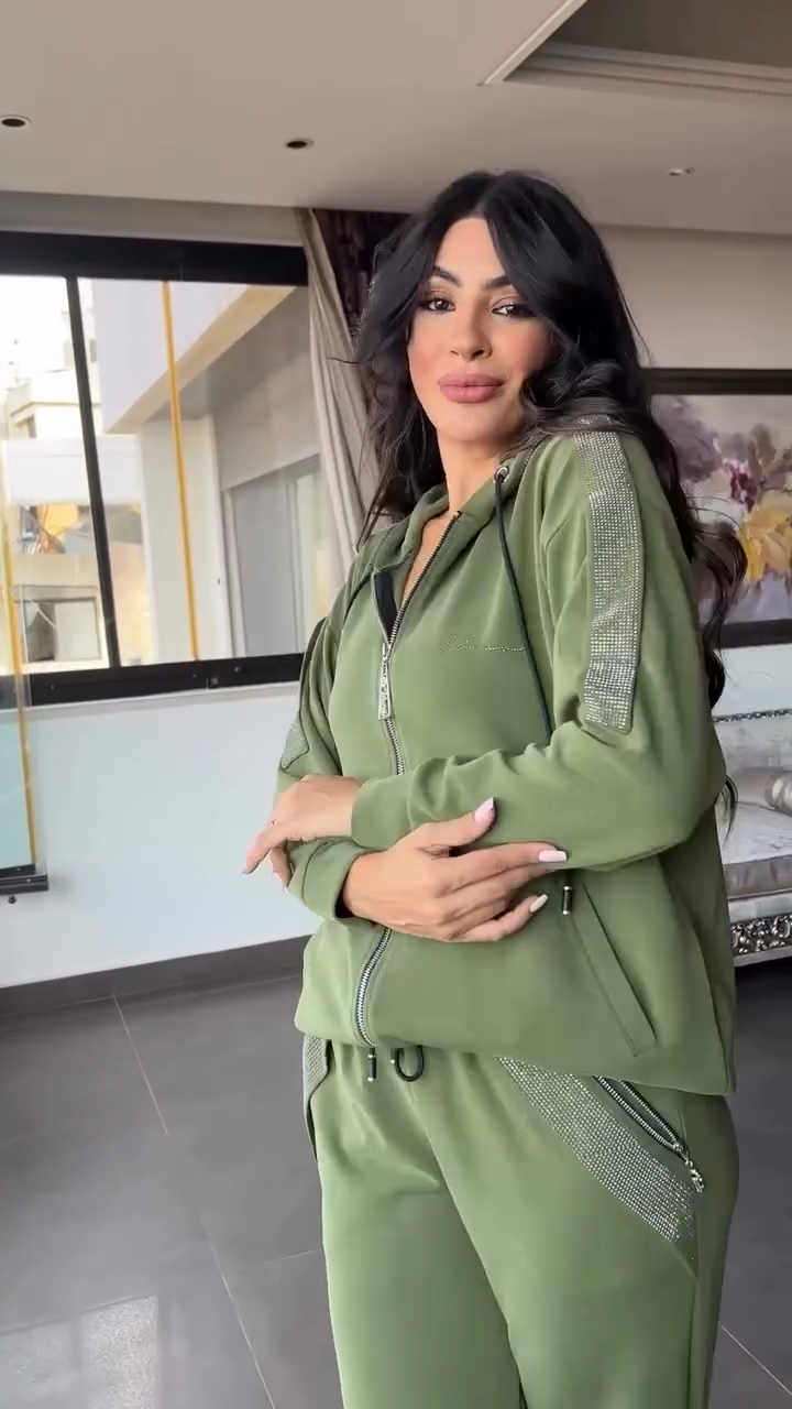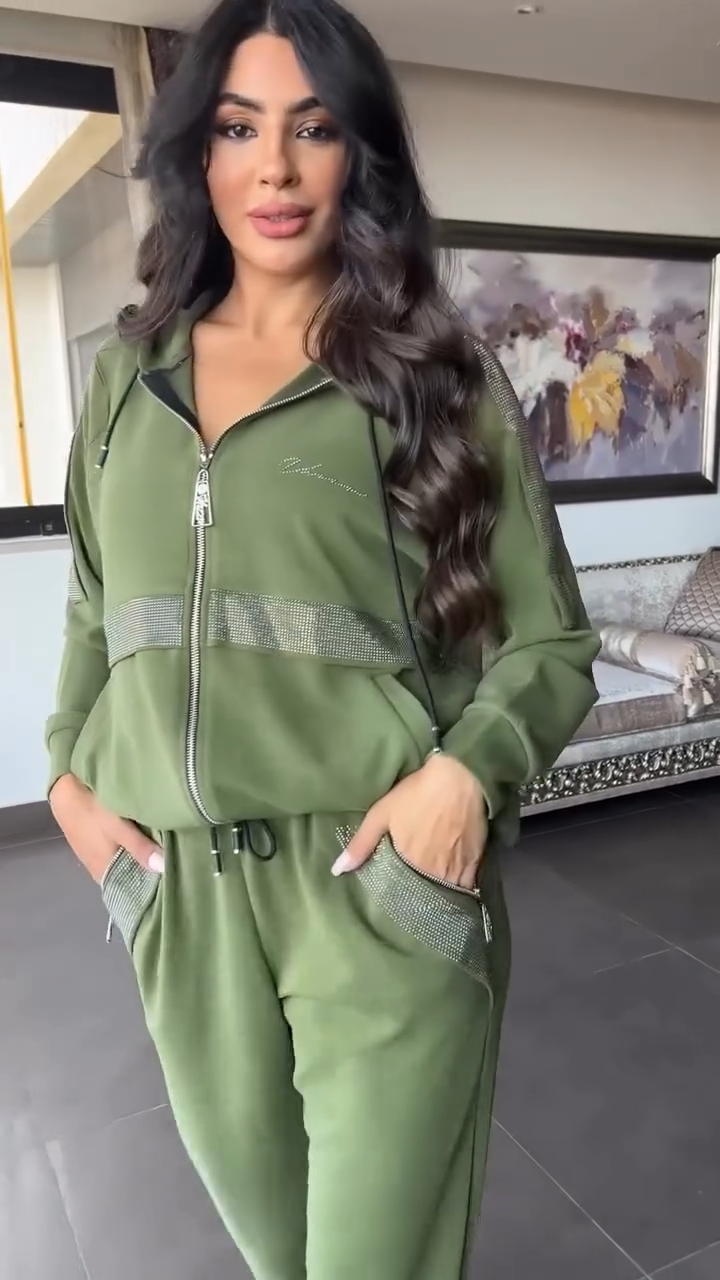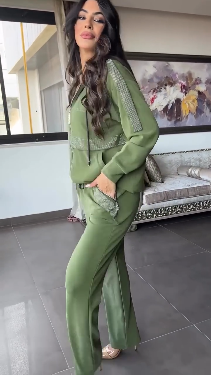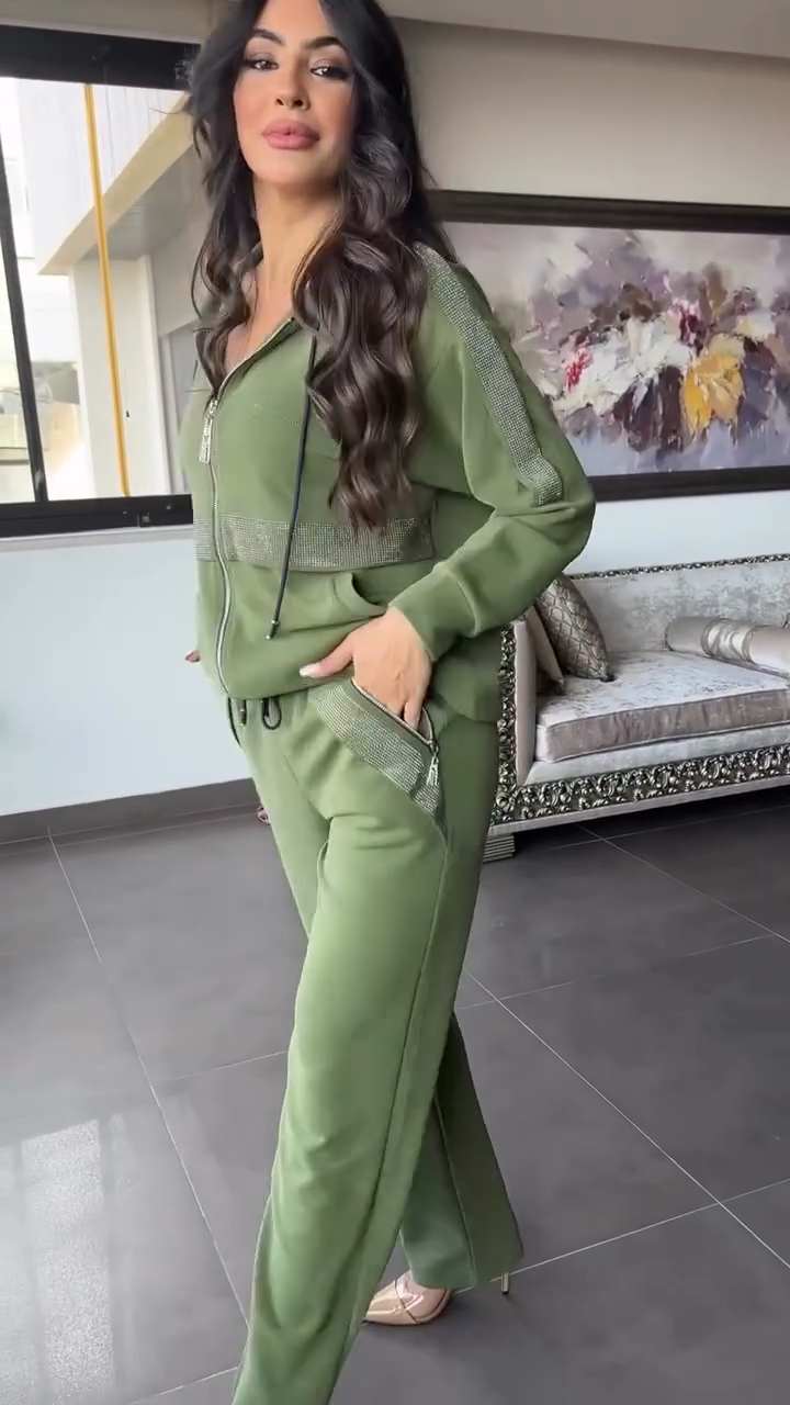 La chaqueta con cierre frontal incorpora detalles brillantes en cintura y bolsillos, aportando un toque moderno y elegante. El pantalón recto, suave y adaptable, estiliza visualmente la silueta y ofrece libertad total al caminar, convirtiéndolo en un conjunto versátil para usar dentro y fuera de casa.