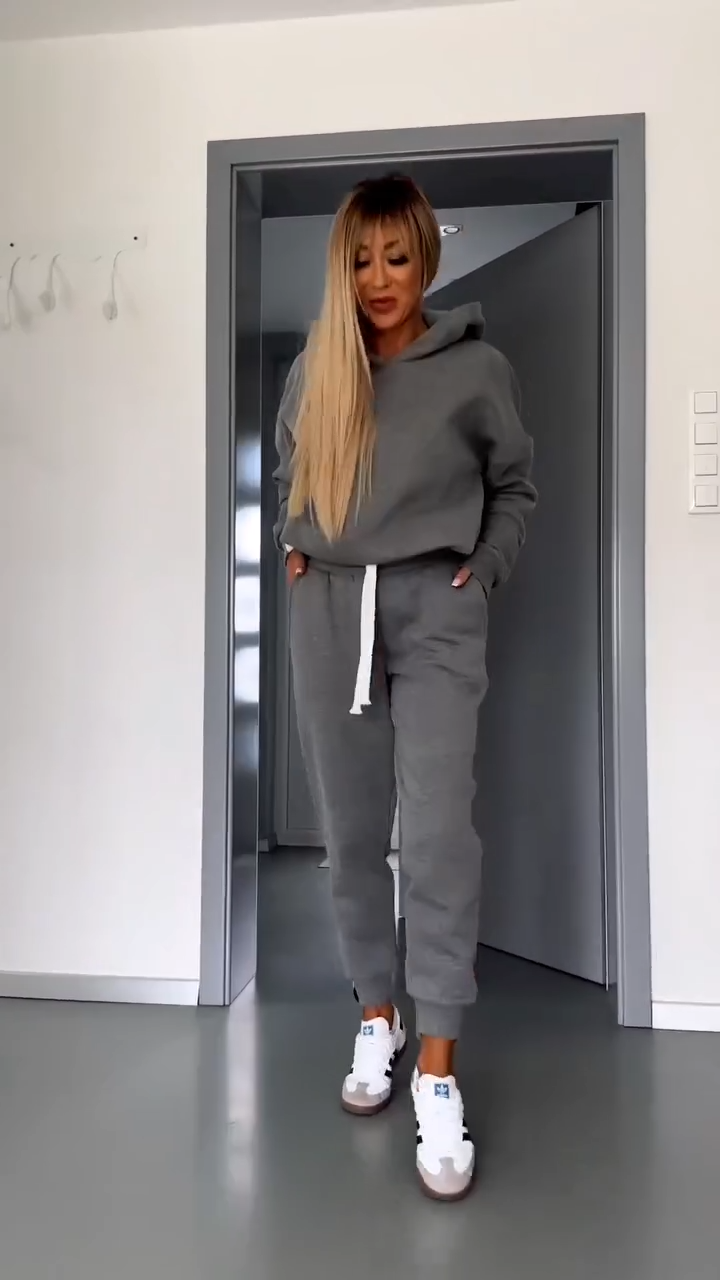 La sudadera presenta capucha amplia, bolsillo frontal tipo canguro y mangas con acabado elástico para conservar el calor y la forma. El pantalón jogger, con cintura ajustable y puños en los tobillos, garantiza un calce cómodo y favorecedor.