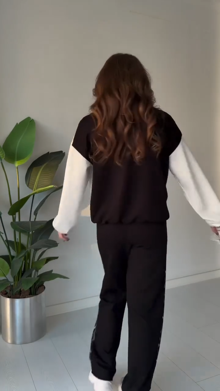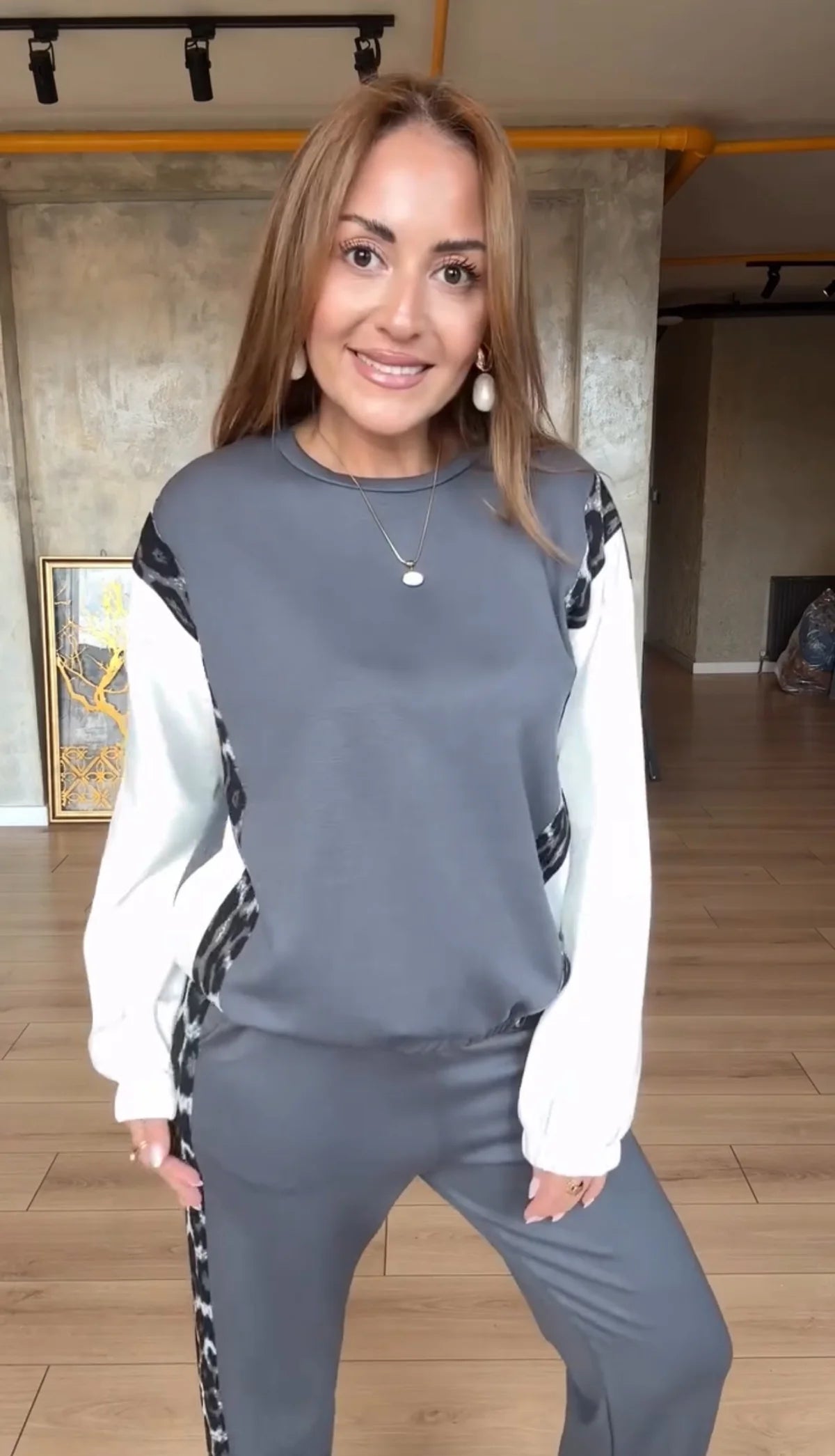 Suéter de corte relajado con mangas amplias en tono contrastante y detalles de estampado animal en los laterales que aportan dinamismo al diseño. El pantalón recto, con la misma línea lateral en print, estiliza la figura y alarga visualmente las piernas